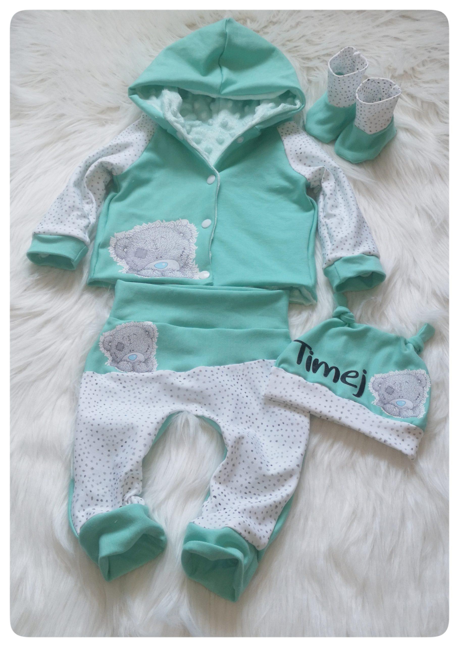 Kompletek je na voljo od velikosti 56 do 92. Za naročilo pošljite povpraševanje in napišite željeno velikost ter napis oz.ime, ki ga želite imeti na kapici.