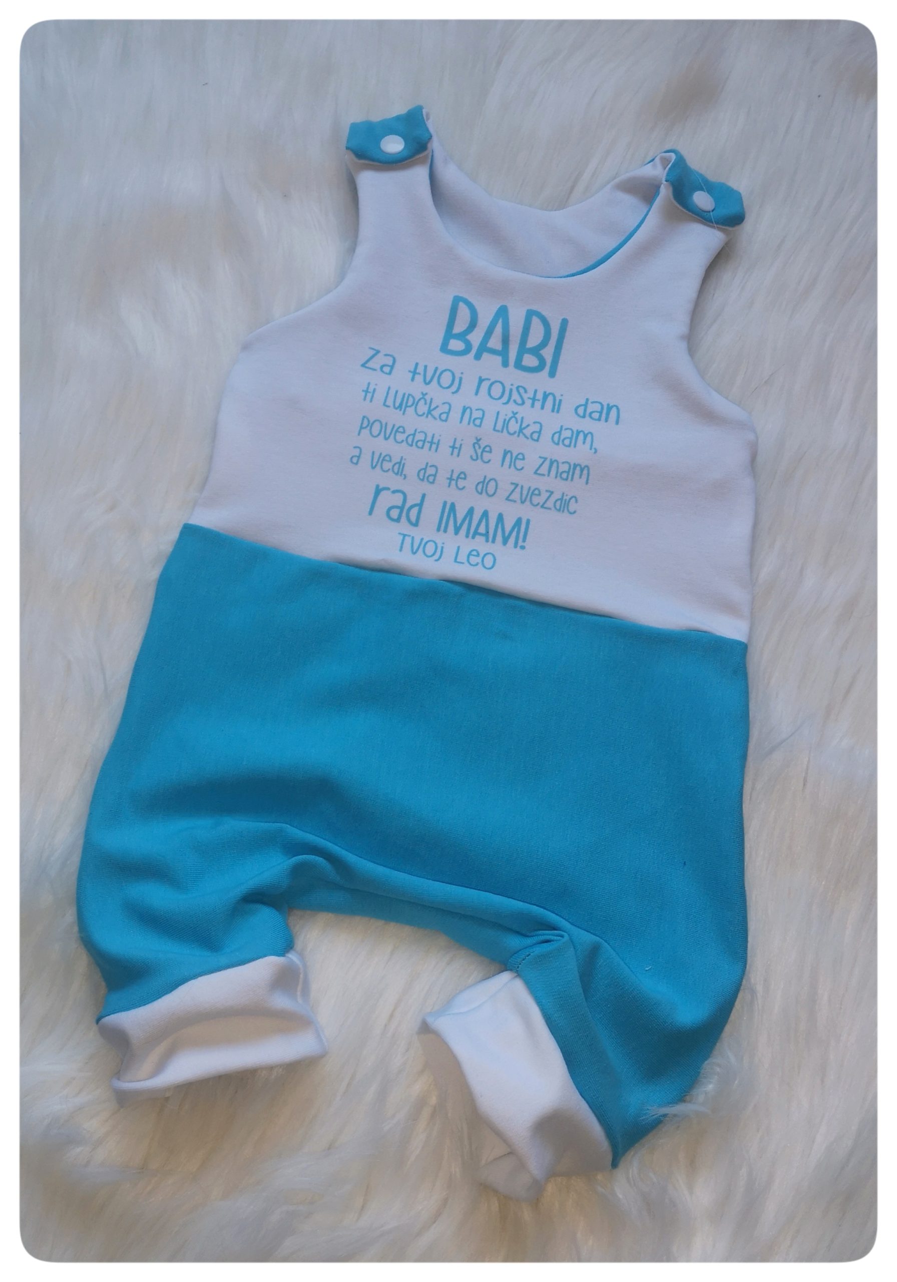 Romperček je na voljo od velikosti 56 do 92. Za naročilo pošljite povpraševanje in napišite željeno velikost ter napis. Možne so tudi druge barvne kombinacije romperčka in pisave.